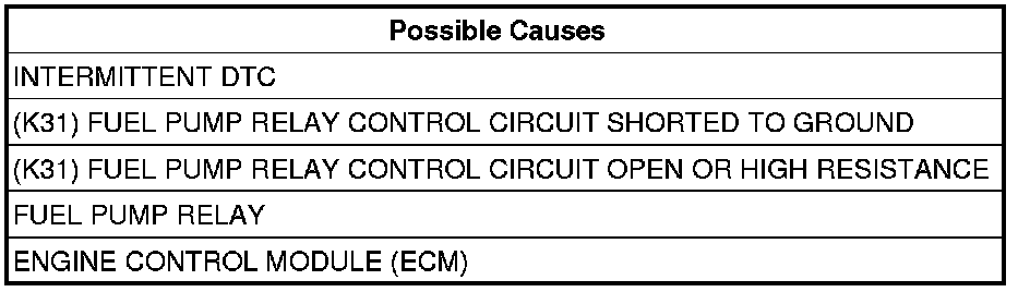 - Repair the (K31) Fuel Pump Relay Control circuit for an open circuit or high resistance.