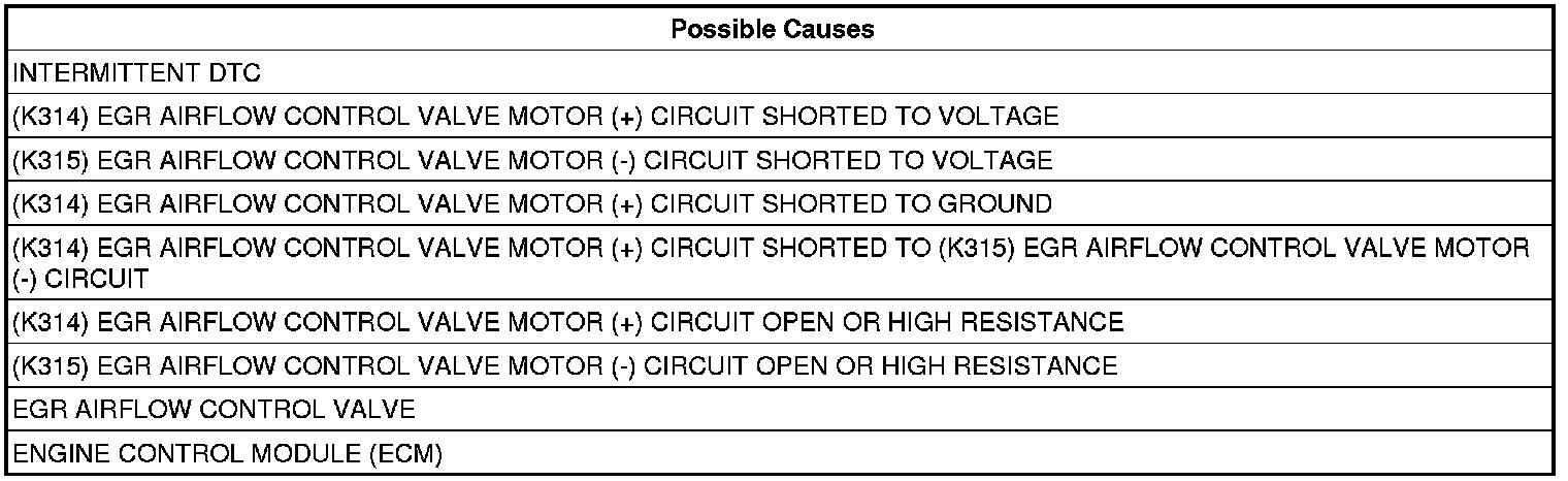 - Repair the (K314) EGR Airflow Control Valve Motor (+) circuit for a short to voltage.