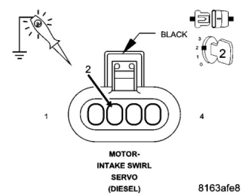 Using a 12 volt test light connected to 12 volts, check the (N117) Intake Swirl Servo Motor Control circuit in the Swirl Solenoid harness connector.