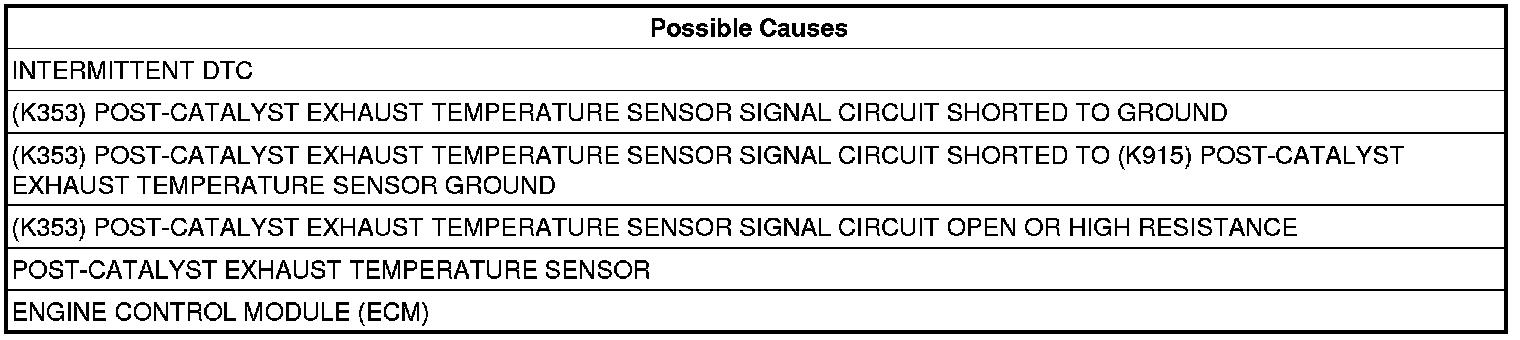 - Repair the (K353) Post-Catalyst Exhaust Temperature Sensor Signal circuit for a short to the (K915) Post-Catalyst Exhaust Temperature Sensor Ground circuit.