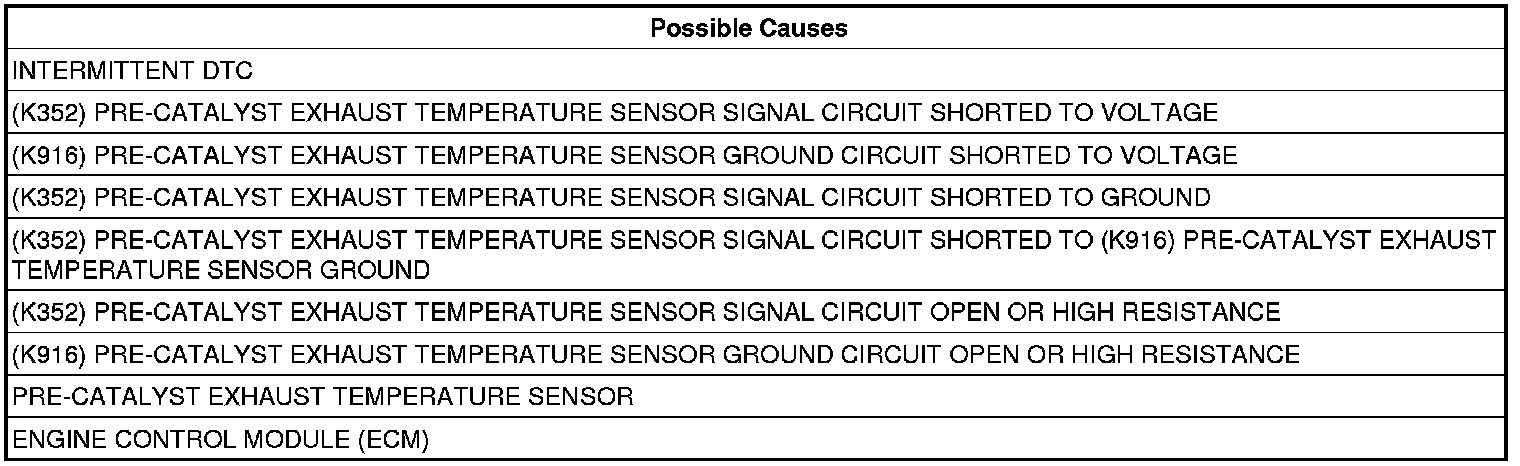 - Repair the (K352) Pre-Catalyst Exhaust Temperature Sensor Signal circuit for a short to the (K916) Pre-Catalyst Exhaust Temperature Sensor Ground circuit.