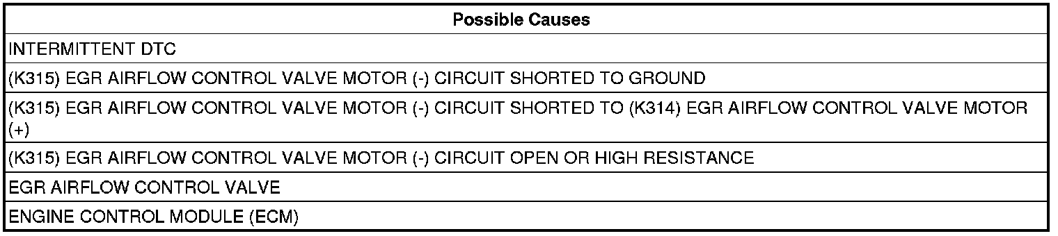 - Repair the (K315) EGR Airflow Control Valve Motor (-) circuit for an open circuit or high resistance.