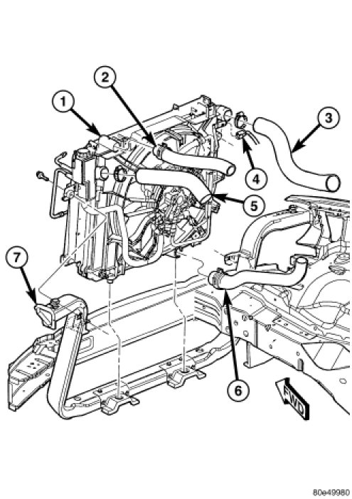 NOTE: Care must be taken when installing the radiator not to damage the fins of the radiator or other ancillary components. Note the location and proper installation of the radiator to charge air cooler and radiator to body rubber air seals. These must be installed correctly to prevent engine over heating and provide proper A/C efficiency.