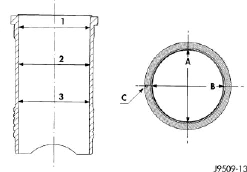 Measure the cylinder bore at three levels in directions A and B. Top measurement should be 10 mm (3/8 in.) down and bottom measurement should be 10 mm (3/8 in.) up from the bottom bore.