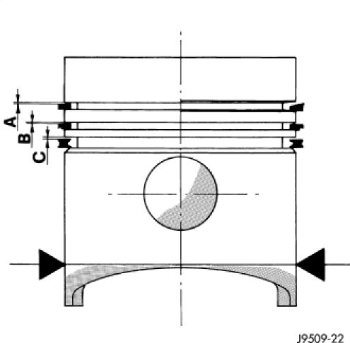 3. Check piston ring to groove clearance. Top compression ring gap 0.12 to 0.16 mm (.0048 to.0063 in.) (A). Second compression ring gap 0.065 to 0.110 mm (.0026 to.0044 in.) (B). Oil control ring gap 0.03 to 0.07 mm (.0012 to.0028 in.) (C).