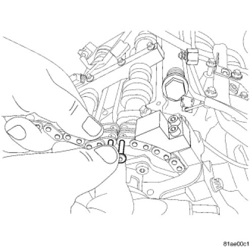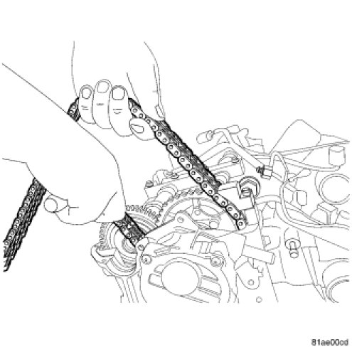 NOTE: Draw out the end of old timing chain evenly as it becomes free, to the same extent that new timing chain is drawn in.