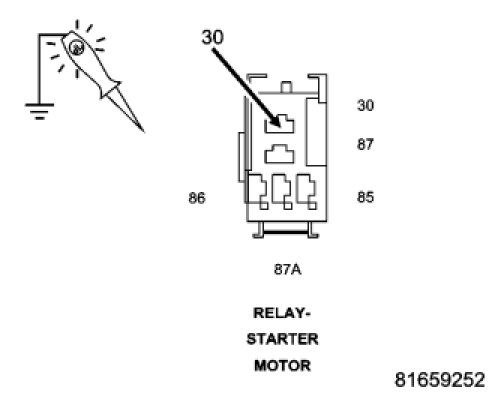Momentarily jumper Starter Relay connector cavities 30 and 87 in the PDC connector.