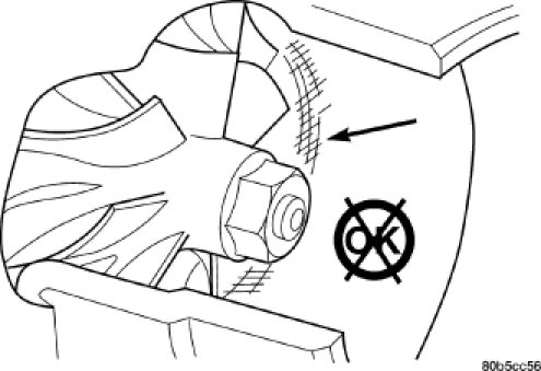 2. Visually inspect the impeller and compressor wheel fins for nicks, cracks, or chips. Note: Some impellers may have a factory placed paint mark which, after normal operation, appears to be a crack. Remove this mark with a suitable solvent to verify that it is not a crack.