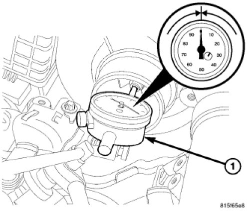 a. Install a dial indicator (1) as shown. Zero the indicator at one end of travel.