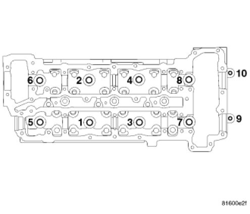 - Tighten M12 cylinder head bolts 1 through 8, in the sequence shown to 60 Nm (44 ft. lbs.).