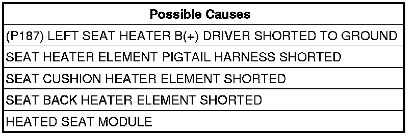 Measure between the (P187) Left Seat Heater B(+) Driver circuit at the seat inline connector (seat side) and the seat frame for a short to ground.