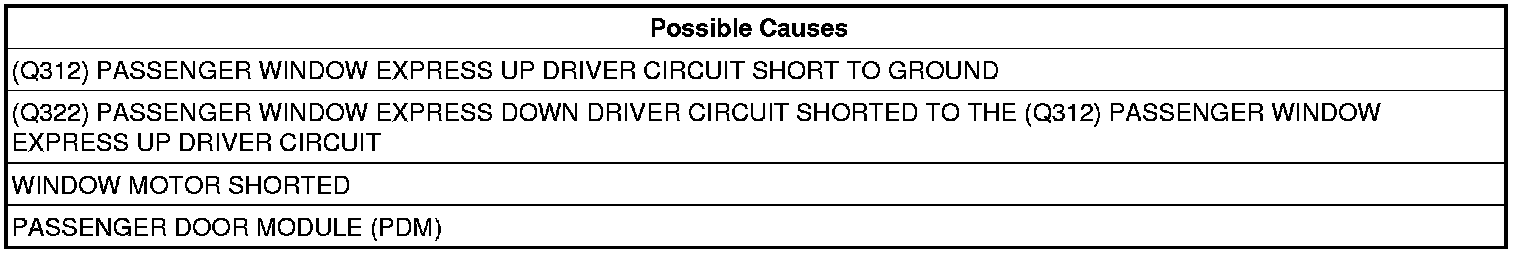 - Repair the (Q322) Passenger Window Express Down Driver circuit for a short to the (Q312) Passenger Window Express Up Driver circuit.