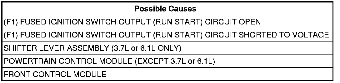 The (F942) Fused Ignition Switch Output circuit supplies the FCM with battery power. The FCM processes the input and sends it out as the (F1) Fused Ignition Switch Output circuit to the Shift Lever assembly (3.7L or 6.1L) or the PCM (except 3.7L or 6.1L).