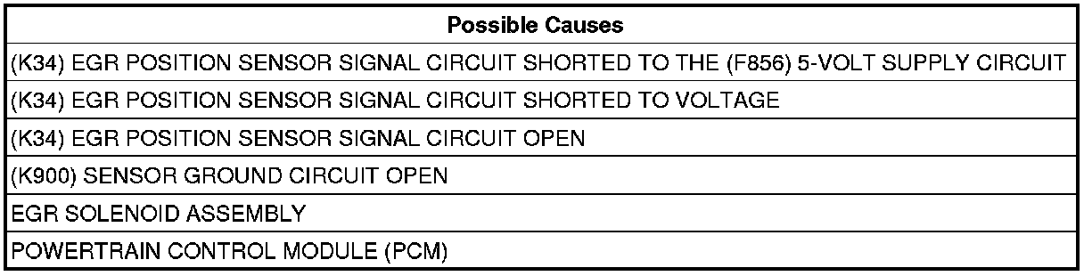 - Repair the short between the (K34) EGR Position Sensor Signal circuit and the (F856) 5-volt Supply circuit.