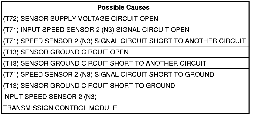 - Repair the (T71) Input Speed Sensor 2 (N3) Signal circuit for an open.
