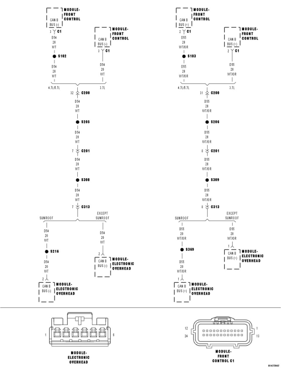 Measure the resistance of the (D54) Can B Bus (-) circuit between the Front Control Module C1 harness connector and the Electronic Overhead Module harness connector.