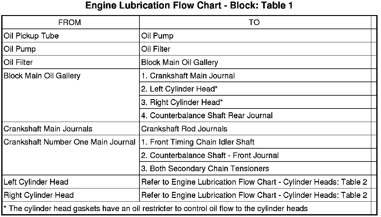 The camshaft exhaust valve lobes and rocker arms are lubricated through a small hole in the rocker arm; oil flows through the lash adjuster then through the rocker arm and onto the camshaft lobe. Due to the orientation of the rocker arm, the camshaft intake lobes are not lubricated in the same manner as the exhaust lobes. The intake lobes are lubricated through internal passages in the camshaft. Oil flows through a bore in the No. 3 camshaft bearing bore, and as the camshaft turns, a hole in the camshaft aligns with the hole in the camshaft bore allowing engine oil to enter the camshaft tube. The oil then exits through 1.6 mm (0.063 in.) holes drilled into the intake lobes, lubricating the lobes and the rocker arms.