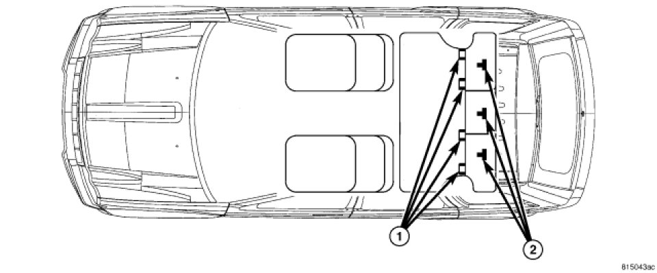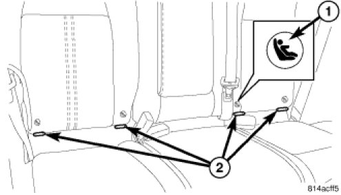 This vehicle is equipped with a Lower Anchors and Tether for Children, or LATCH child restraint anchorage system. The LATCH system provides for the installation of suitable child restraints in certain seating positions without using the standard equipment seat belt provided for that seating position. The rear seats in these vehicles are equipped with a fixed-position child restraint upper tether anchor (2) for both the center and the two outboard seating positions, and child restraint lower anchors (1) for the two outboard seating positions only.