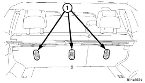 The three upper tether anchors (1) are integral to the rear seat back panels. One anchor is integral to the back of the right rear panel, and two are integral to the left rear panel. These anchors are each constructed from short lengths of heavy-gauge steel wire that is securely welded into stamped steel cups that are integral to the seat back panels. There is a separate molded plastic trim bezel located around each of the three anchors. These child restraint upper tether anchors cannot be adjusted or repaired and, if ineffective or damaged, they must be replaced as a unit with their respective rear seat back panels.