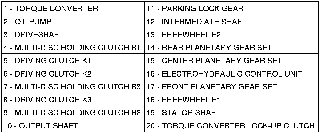 The NAG1 automatic transmission is an electronically controlled 5-speed transmission with a lock-up clutch in the torque converter. The ratios for the gear stages are obtained by 3 planetary gear sets. Fifth gear is designed as an overdrive with a high-speed ratio.