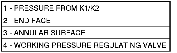 The working pressure (p-A) is regulated at the working pressure regulating valve (4) in relation to load (modulating pressure, p-Mod) and gear (K1 or K2 pressure) (1). The spring in the working pressure regulating valve sets a minimum pressure level (basic pressure).
