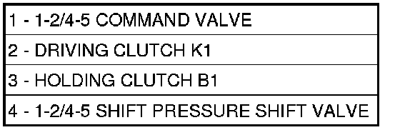 The shift pressure is determined by the shift pressure regulating solenoid valve and the shift pressure regulating valve (1). In addition, pressure from the clutch K2 is also present at the annular surface of the shift pressure regulating valve. This reduces the shift pressure in 2nd gear.