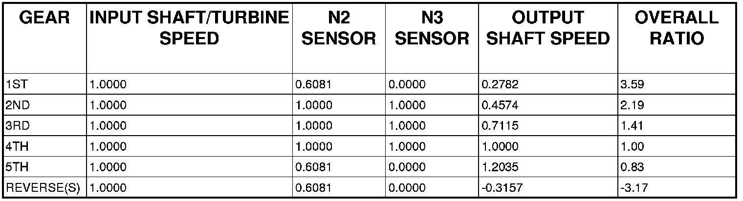 Based on the preceding chart, it appears that N3 sensor is redundant and provides no additional information. However, the TCM needs to know Input Shaft/Turbine speed. Since the N2 sensor is not directly tied to the Input Shaft, the N3 sensor is required to inform the TCM to divide the N2 value by 0.6081 or 1.0000 to calculate actual Turbine speed.