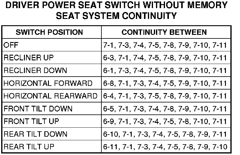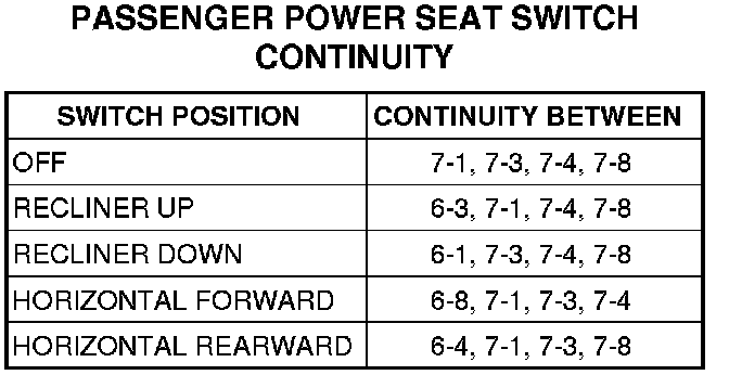 3. Use an ohmmeter to test the continuity of the power seat switch. Refer to the appropriate diagnostic information table. If not OK, replace the faulty power seat switch. If switch tests OK Testing and Inspection.