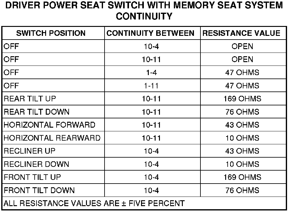 3. Use an ohmmeter to test the resistance of the power seat switch. Refer to the appropriate diagnostic information table. If not OK, replace the faulty power seat switch. If switch tests OK Testing and Inspection.