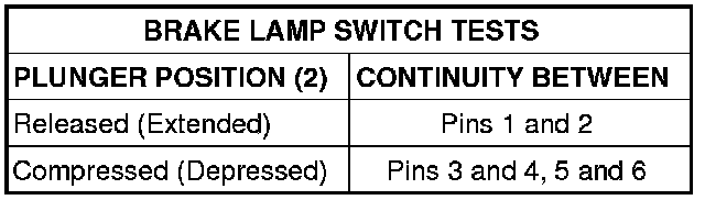 3. Using an ohmmeter, perform the continuity tests at the terminal pins (1) in the brake lamp switch connector receptacle as shown in the Brake Lamp Switch Tests table.