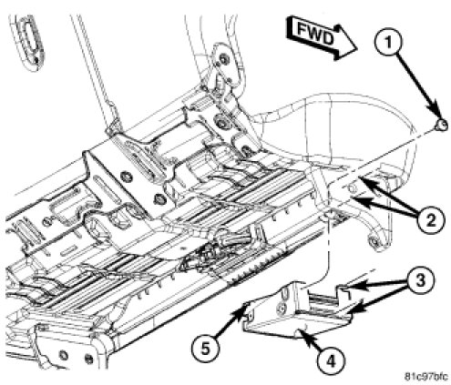 4. Slide the module rearward to release the mounting tabs (3) from the slots in the seat frame (2).