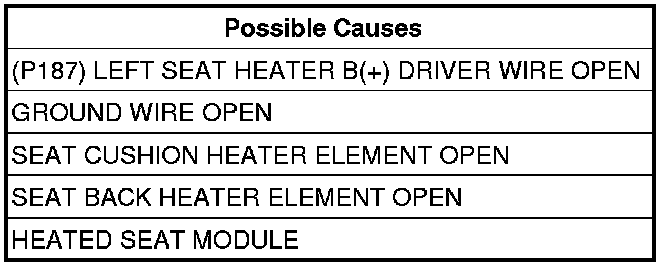 - Repair the (P187) Left Seat Heater B(+) Driver circuit for an open back to the splice.