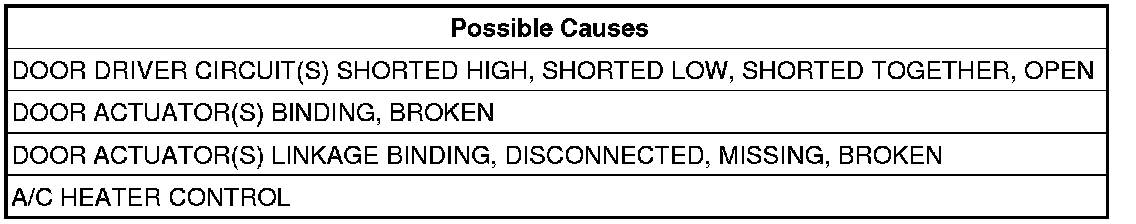 The A/C Heater Control monitors the door driver circuits during actuator operation for conditions that prevent proper door operation. If a pulse count error is detected the A/C Heater Control reports the fault as a Actuator Performance DTC. It is important to note that this DTC only indicates that a fault occurred while driving a door actuator and that additional testing is necessary to provide more details about the reported fault.