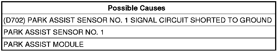 - Repair the (D702) Park Assist Sensor No. 1 Signal circuit for a short to ground.