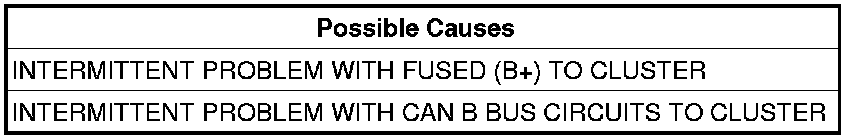 - Remove the Cluster and inspect the Fused B (+) and both CAN B BUS circuits for spread terminals or intermittent opens.
