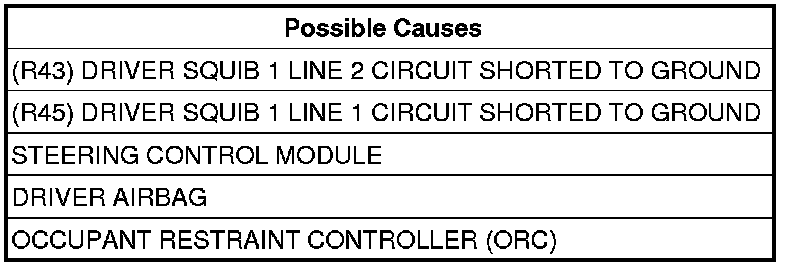 With the ignition on, the Occupant Restraint Controller (ORC) monitors the resistance of the Driver Squib 1 circuits.