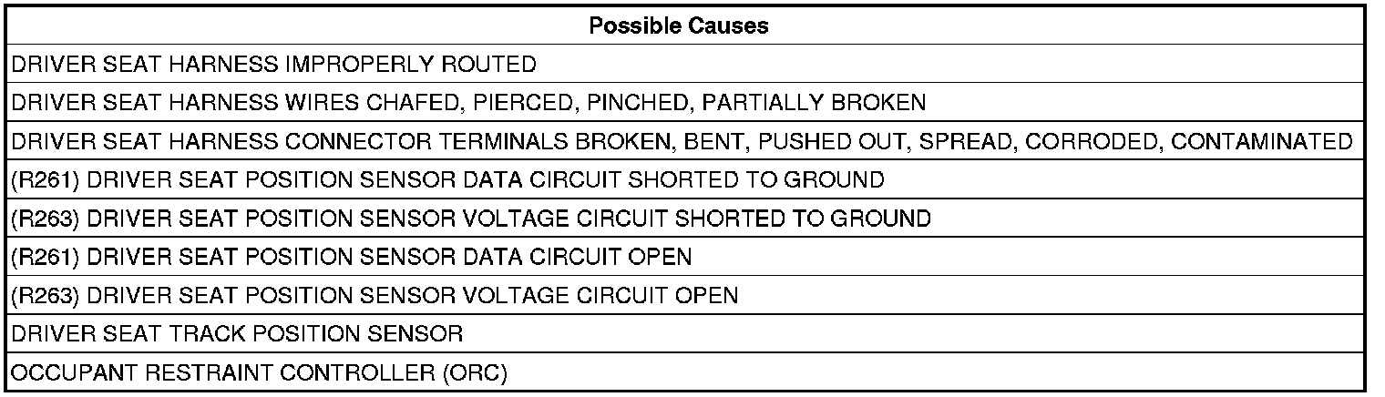 5. CHECK (R261) DRIVER SEAT POSITION SENSOR DATA CIRCUIT AND (R263) DRIVER SEAT POSITION SENSOR VOLTAGE CIRCUIT FOR A SHORT TO GROUND
