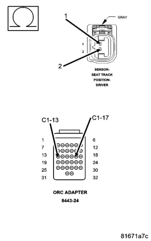 Measure the resistance of the (R261) Driver Seat Position Sensor Data circuit between the ORC-C1 connector cavity C1-13 and the Driver Seat Track Position Sensor connector cavity 1.