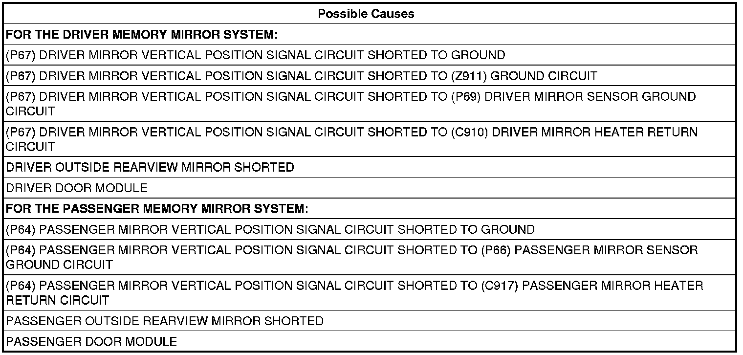 - Repair the (P64) Passenger Mirror Vertical Position Signal circuit for a short to the (C917) Passenger Mirror Heater Return circuit.