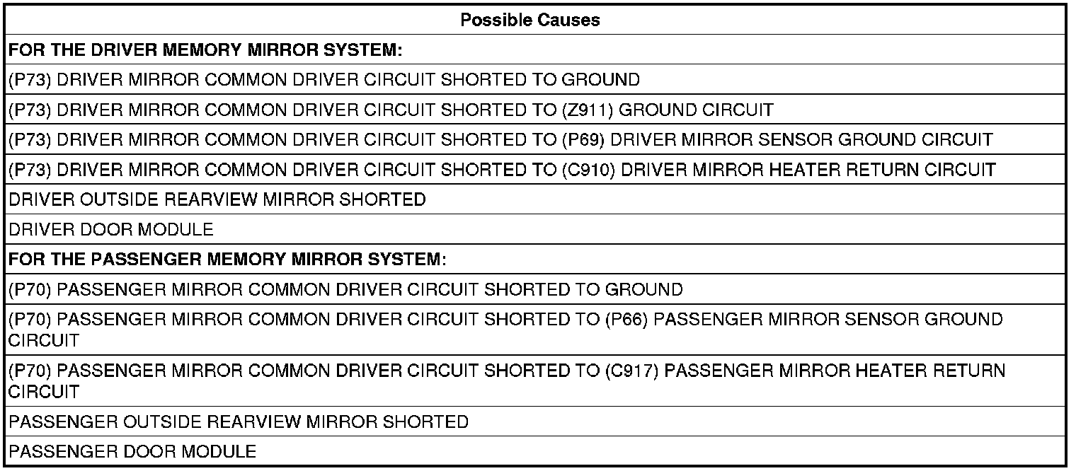 - Repair the (P73) Driver Mirror Common Driver circuit for a short to the (P69) Driver Mirror Sensor Ground circuit.