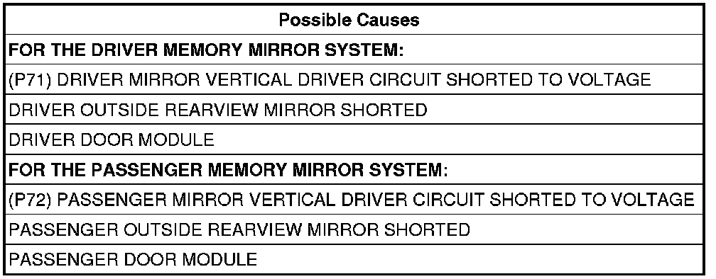 - Repair the (P72) Passenger Mirror Vertical Driver circuit for a short to voltage.