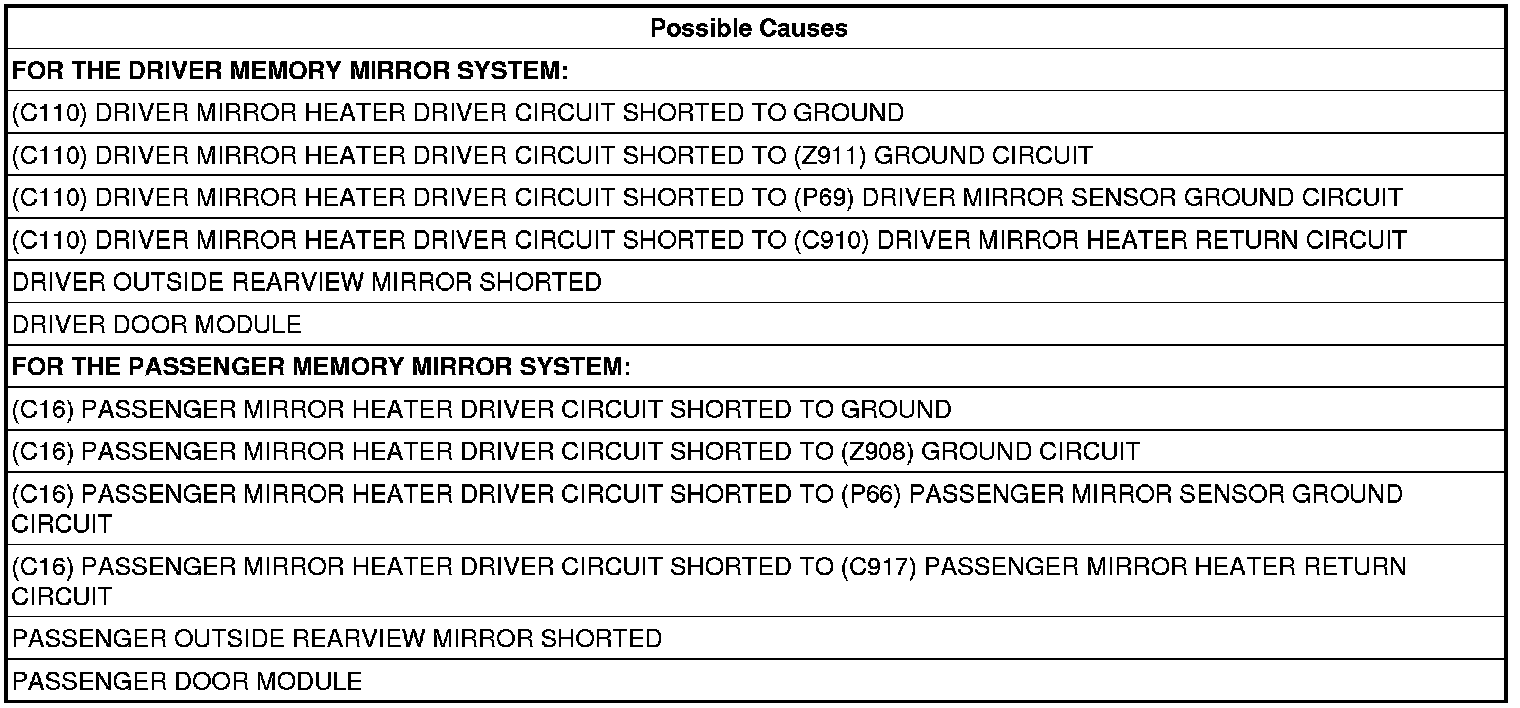 - Repair the (C110) Driver Mirror Heater Driver circuit for a short to the (Z911) Ground circuit.
