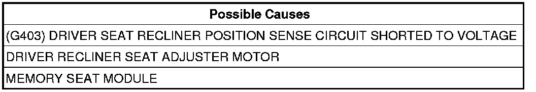 - Inspect the position sense wire for a possible intermittent short to voltage from another circuit, if OK replace the Driver Recliner Seat Adjuster Motor assembly.