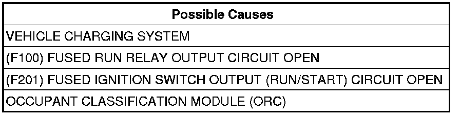While the Occupant Restraint Controller (ORC) CAN bus ignition status received is RUN or Signal Not Available (SNA), the module checks the (F100) Fused Run relay Output circuit and (F201) Fused Ignition Switch Output (Run/Start) circuit voltage input range.