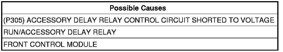 3. (P305) ACCESSORY DELAY RELAY CONTROL CIRCUIT SHORTED TO VOLTAGE