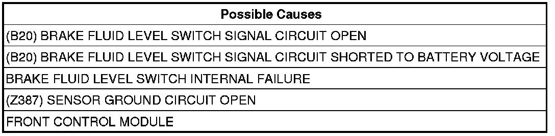 - Repair the (B20) Brake Fluid Level signal circuit for a short to voltage.