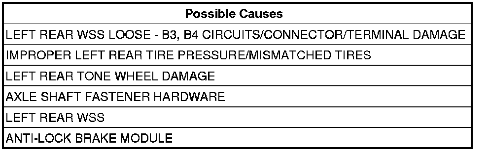 Inspect the (B3) Left Rear WSS Signal and (B4) Left Rear WSS Supply circuits between the Left Rear WSS and Anti-Lock Brake Module for damage.