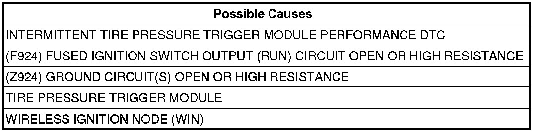 NOTE: Three trigger modules are located in three of the four wheel wells on the vehicle to provide the WIN with the location of the tire pressure sensors on the vehicle. A fourth transponder is not necessary in the remaining wheel well due to the process-of-elimination theory. Once the system knows the location of the first three sensors it assumes the location of the fourth tire pressure sensor. The locations of the trigger modules can vary for each vehicle. Make sure the vehicle has trigger modules, and that are in the right locations. After every repair, the trigger module test routine must be rerun in order to verify the fix.