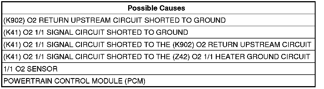 - Repair the short to ground in the (K41) O2 Sensor 1/1 Signal circuit.