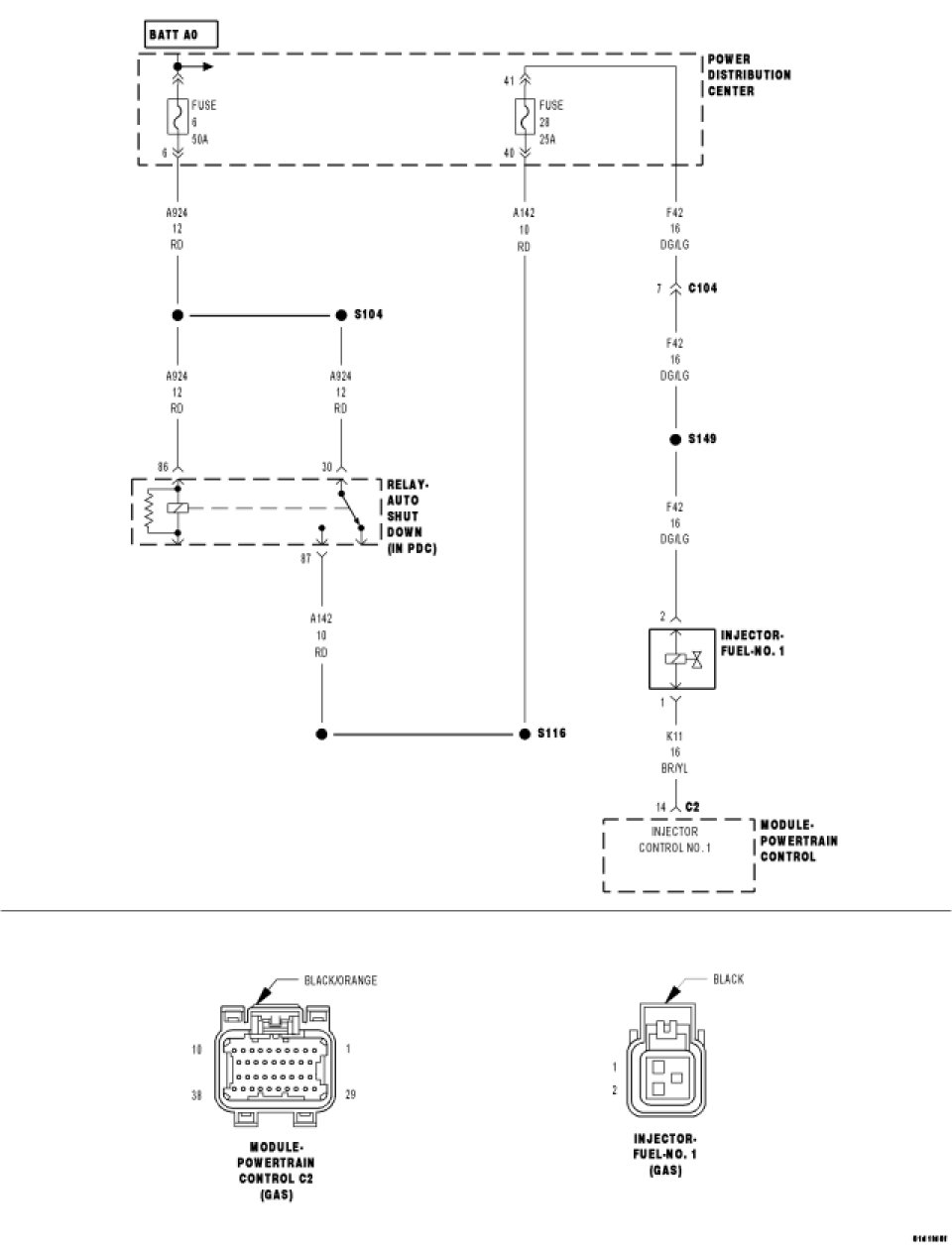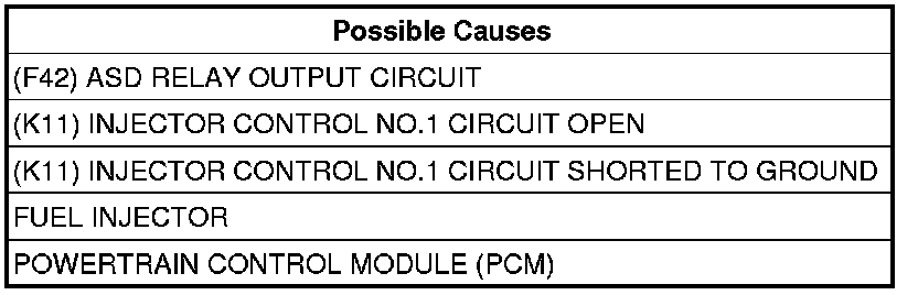 Using a 12-volt test light connected to ground, check the (F42) ASD Relay Output circuit in the Fuel Injector 1 harness connector.